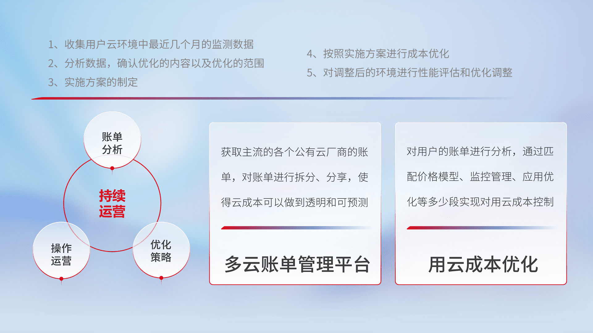 通过多云纳管,,以统一的资源数据模型把客户的云资源进行抽象和封装,,进而实现对多云资源的统一操作,,,保障云资源管理的可靠性、、、、稳定性与可用性。。。。量身定制化运维内容,,配置、、、开发运维、、、补丁管理、、、、备份、、、监控、、、、认证和访问管理、、审计和日常巡检等,,,保障在用云过程中的可靠度,,,稳定度以及高可用率。。。。